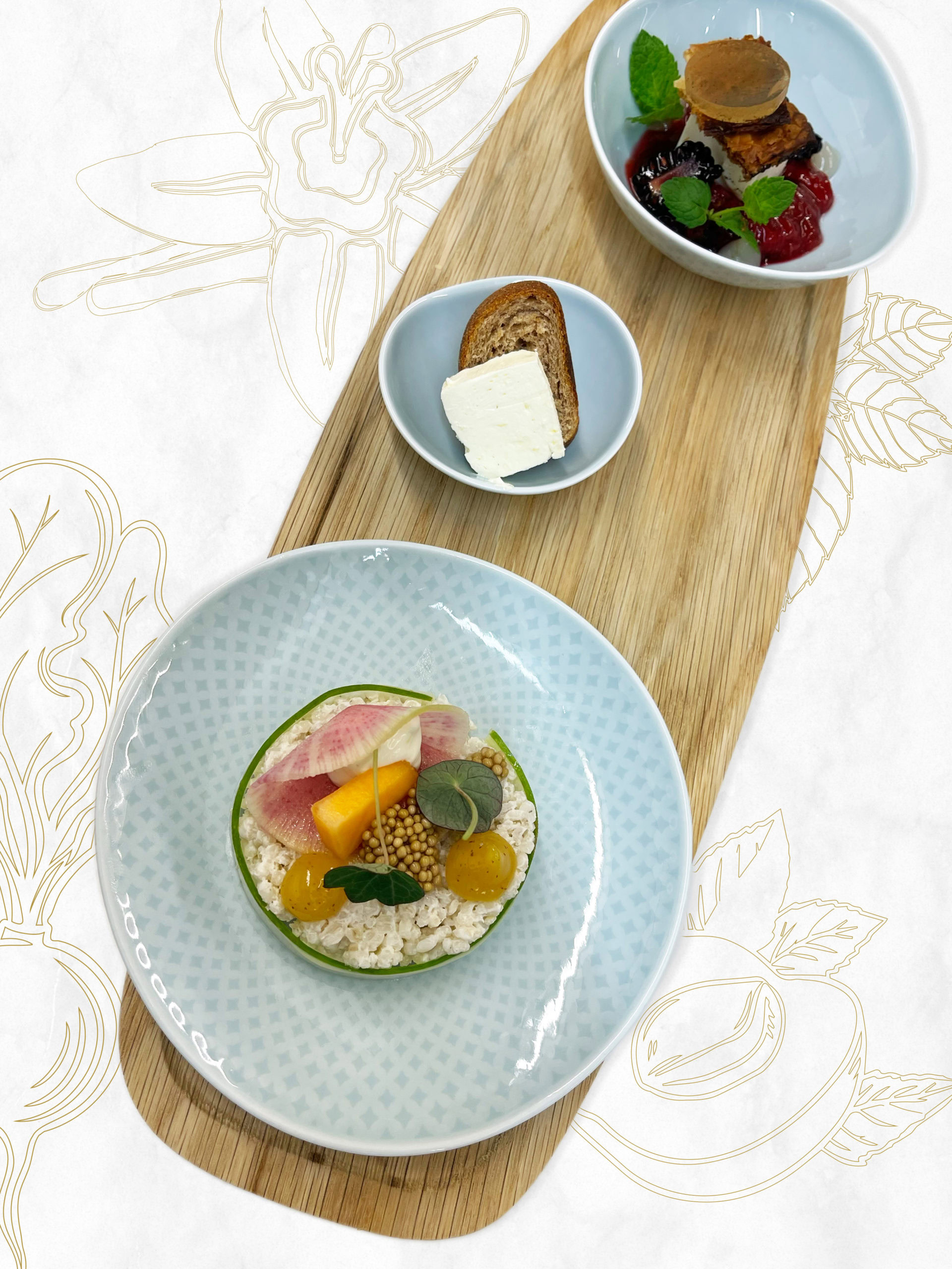 - Perlgraupe mit Rauch Schmand (Gluten/Laktose) , Gurke, Redmeat Rettich gesalzen, Süß-Saurer Vollkornsenf (Gluten/Senf), Zitronen- Sauerrahmcreme ( Laktose), Honig-Senf Gel (Senf/ Agar-Agar), Kapuziner kresse, Melonenkeile