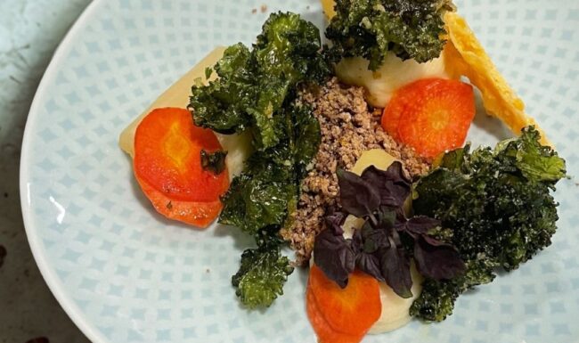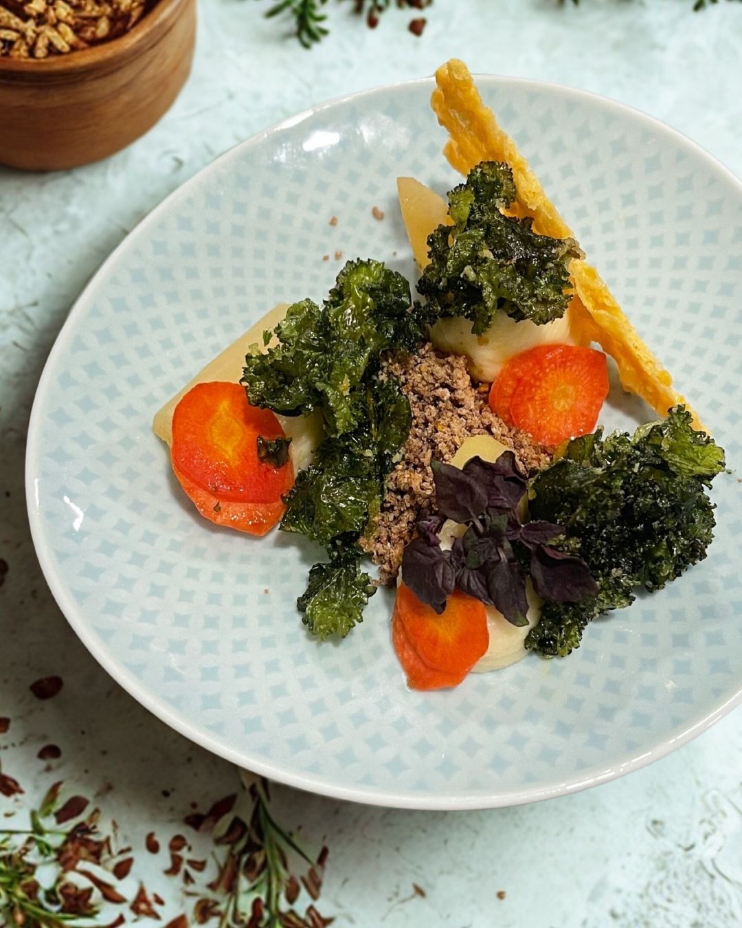 Freuen Sie sich auf gebackenen Grünkohl auf Malzerde mit Parmesankräcker, Petersilienwurzelcreme sowie roh marinierte rote Karottenscheibchen mit Ingwer-Rapsöl. Zitronige Schwarzwurzel und Shiso-Kresse runden diese Komposition harmonisch ab. Dazu servieren wir Sesam-Ciabatta mit Salzbutter.