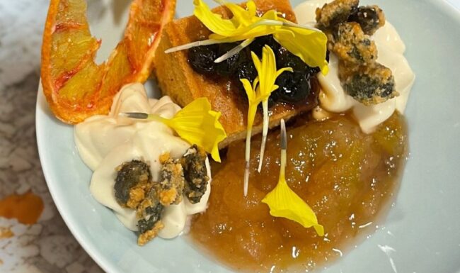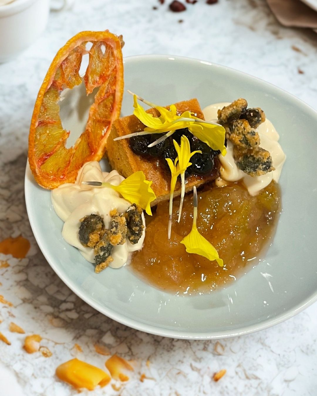 Als süße Aufmerksamkeit erwartet Sie ein Bratapfelschichtel mit Karamellcreme, eingelegten Balsamico-Rosinen, Orangenblütenhonigkuchen, Orangenchip, Tagetes-Blüten und Kürbiskernen.